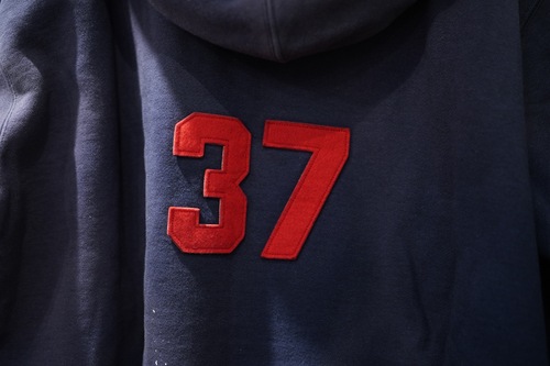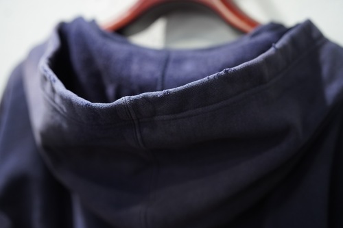 身頃は丸胴仕様で、リブは10番手の糸で編み立てられたリブ。フード部分の生地は1枚仕立てで、首元にはガゼットが付けられる。