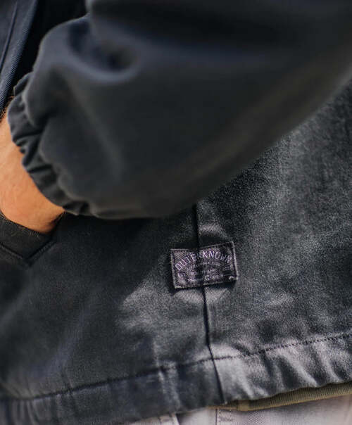 フロントはスナップボタン仕様で、斜めに配置されたウェルトポケット、ドローストリング入りの裾、伸縮性のある袖口など、機能性も充実。