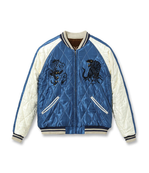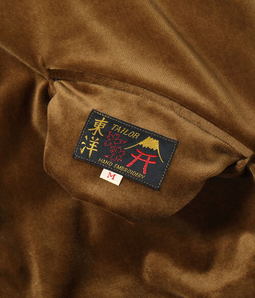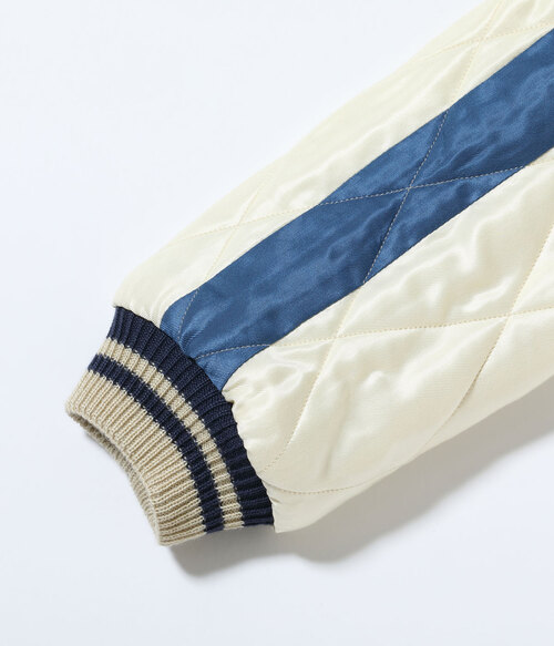 初期のスーベニアジャケットはアセテート生地のリバーシブル仕様が多いが、当時のバリエーションとして毛羽感のある別珍(べっちん)生地を使ったモデルも存在する。中綿を入れることで防寒性を高め、リバーシブル面のアセテートには中綿を押さえるためのキルティングが施されていた。