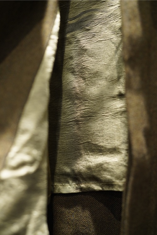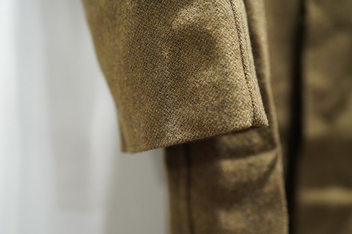 首元のチンストラップや裾のノーベント仕様、美しく広がるAラインのシルエット、そしてスプリットラグランスリーブなどの仕立てが特徴です。