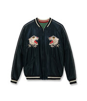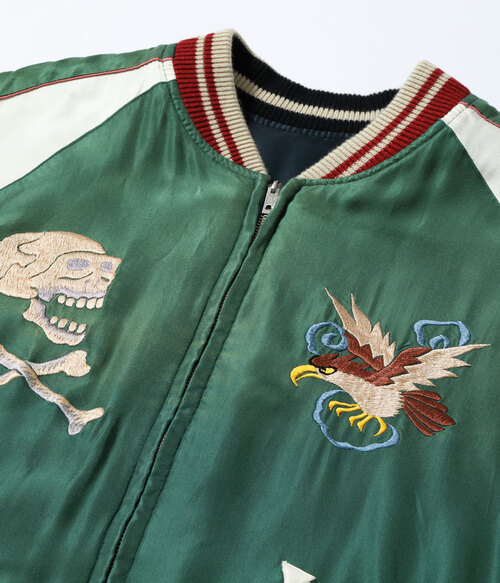 リバーシブル面は「シェビーラバー」と呼ばれる絵柄で、車好きな米兵のカスタムオーダーによるもの。Chevy とは Chevrolet(シボレー)の愛称。当時のアメリカのカスタムカーカルチャーが刺繍されたホットロッドなスカジャンに仕上がっている。エイジング加工によって光沢感が落ち着いたマットなグリーンのサテン生地に対してさらに鮮やかな刺繍のコントラストが際立つ。